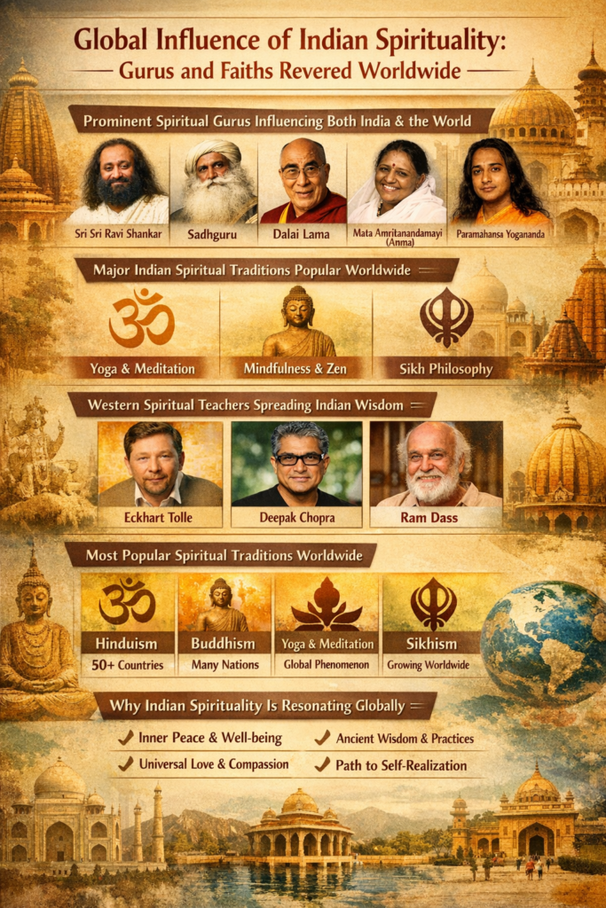 Living spiritual leaders like Sri Sri Ravi Shankar, Sadhguru, Mata Amritanandamayi, the Dalai Lama, and BK Shivani continue traveling internationally to spread teachings of peace and self-awareness. Meanwhile, figures like Deepak Chopra have settled abroad and expanded spiritual outreach globally.