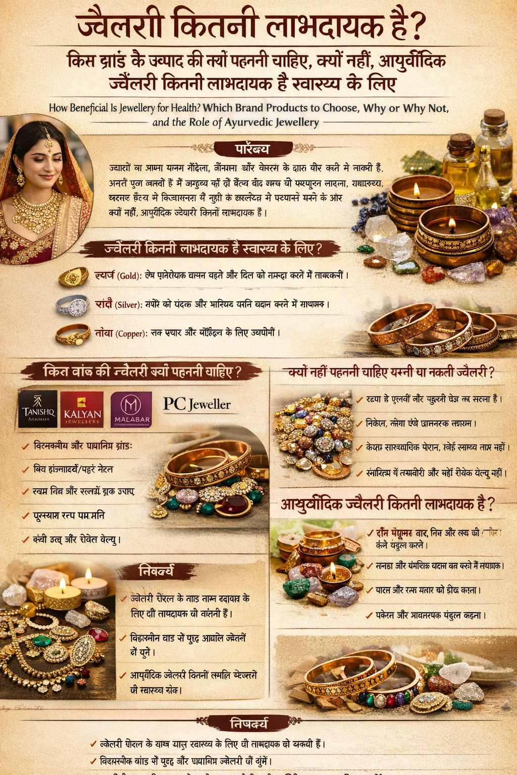 Jewellery has always been a symbol of beauty, tradition, and status. But beyond style and fashion, many people believe that jewellery—especially Ayurvedic or metal-based jewellery—can be beneficial for health. From gold and silver to copper and gemstone jewellery, each has its own importance in traditional beliefs and Ayurveda. In this article, we will explore how jewellery can be beneficial, which brand products are worth buying, why some should be avoided, and how Ayurvedic jewellery may support health.