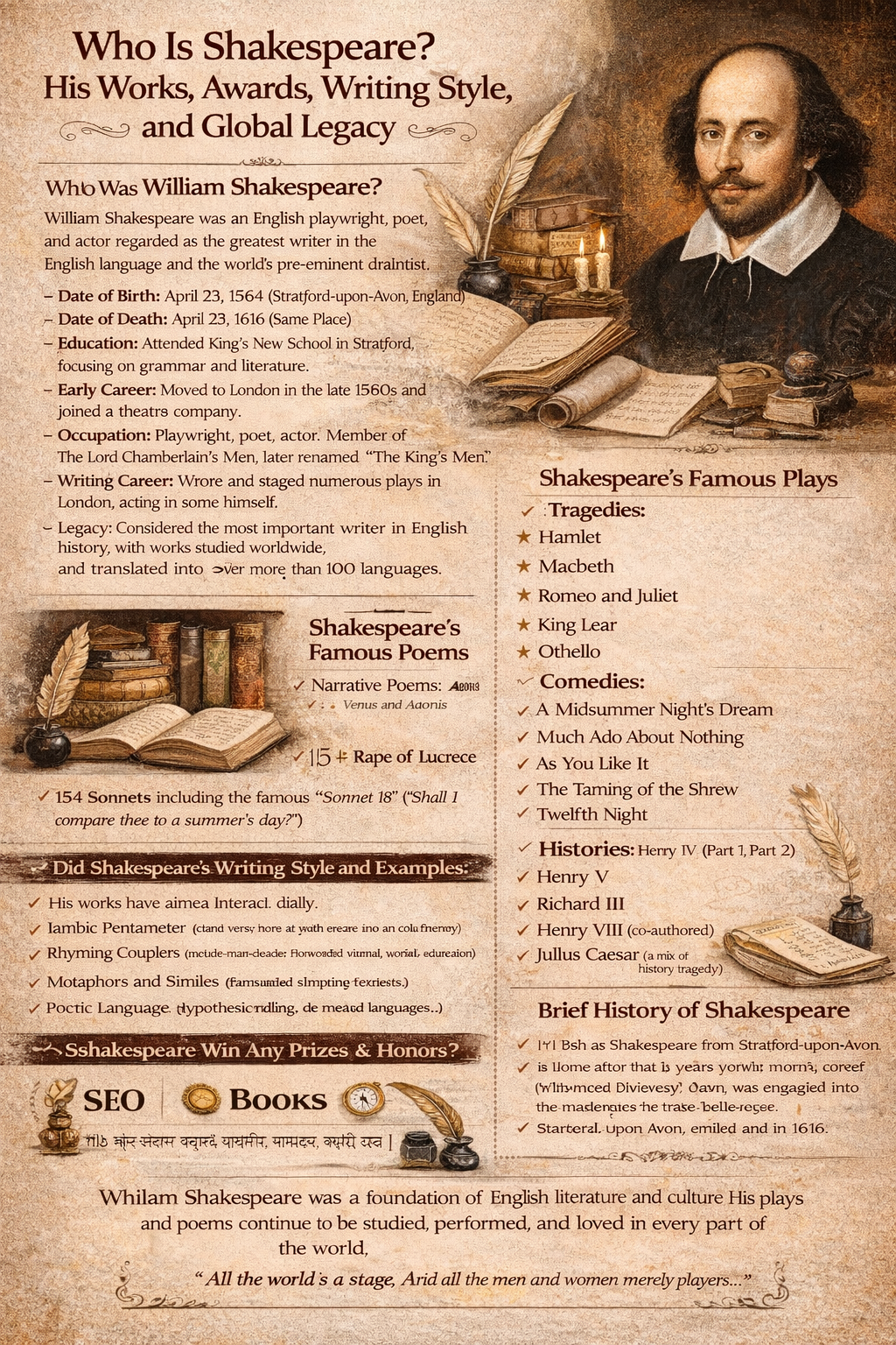 William Shakespeare is one of the greatest writers in the history of world literature. Known as the “Bard of Avon,” Shakespeare was an English playwright, poet, and actor whose works have influenced literature, education, theater, and culture across the globe. His. plays, poems, and stories are studied in school and universities in almost every country. Even after more than 400 years, his writings remain relevant, powerful, and. inspiring.